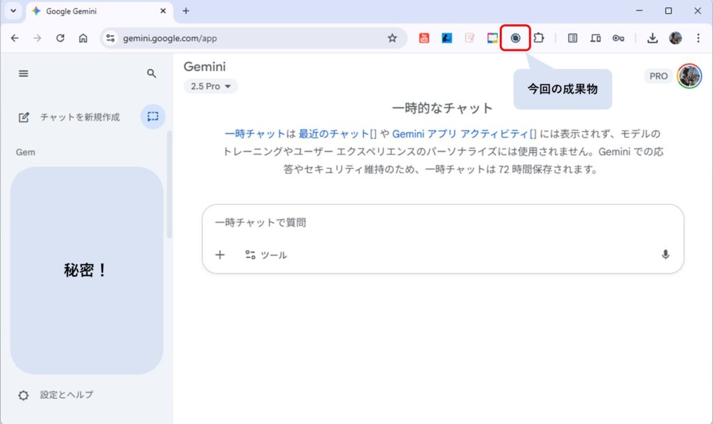 ちなみに、拡張機能のアイコンもAIに「Geminiっぽくて、プライバシーを守る感じのアイコン作って」とお願いして、サクッと生成したものです。アイデアを最速で形にする。現代の開発は、このスピード感が何より重要だと考えています。
